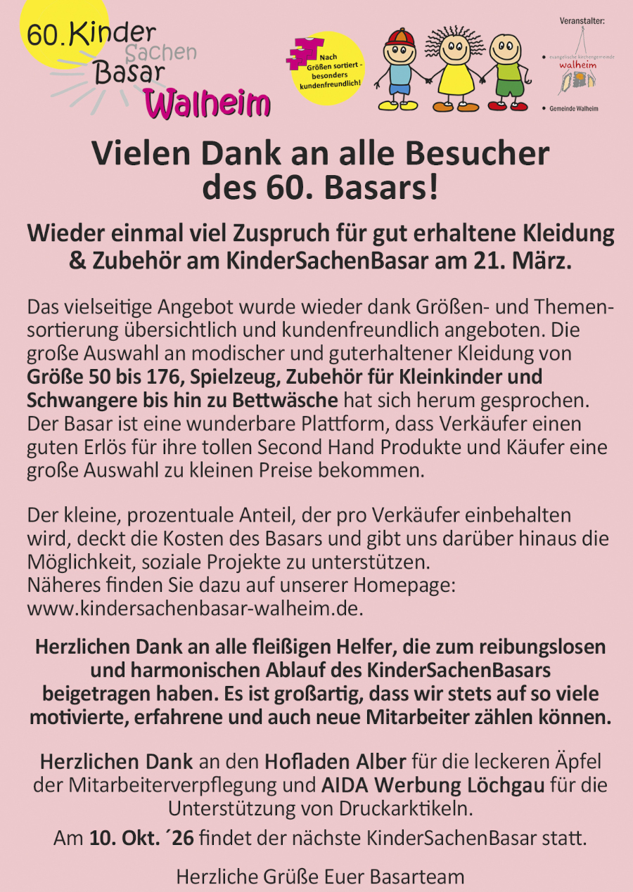 2x im Jahr (Frühjahr + Herbst) findet der Basar in der Gemeindehalle in Walheim statt. Hier können alle gebrauchten aber gut erhaltenen Artikel rund um Kind und Schwangerschaft angeboten oder gekauft werden.