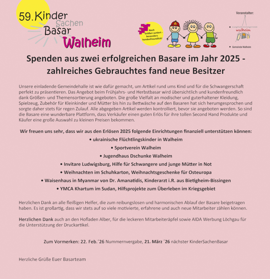 Herzlich Willkommen auf der Homepage zum KinderSachenBasar in Walheim2x im Jahr (Frühjahr + Herbst) findet der Basar in der Gemeindehalle in Walheim statt.